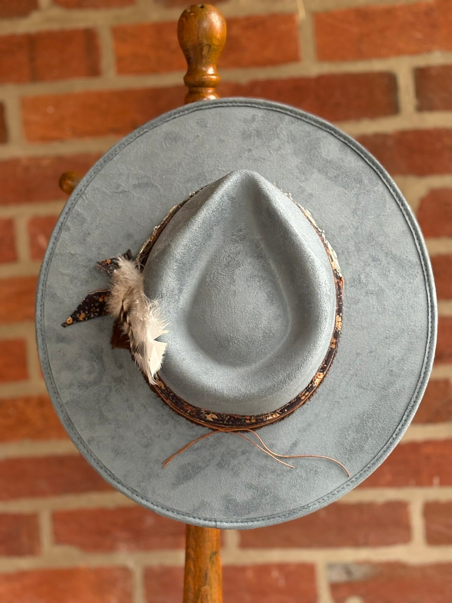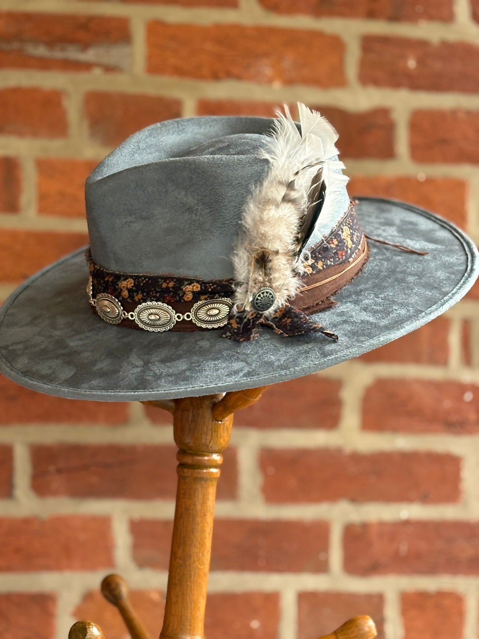 The blue rancher hat with a true western feel features both a chain enhancer and a feather fantisizer.