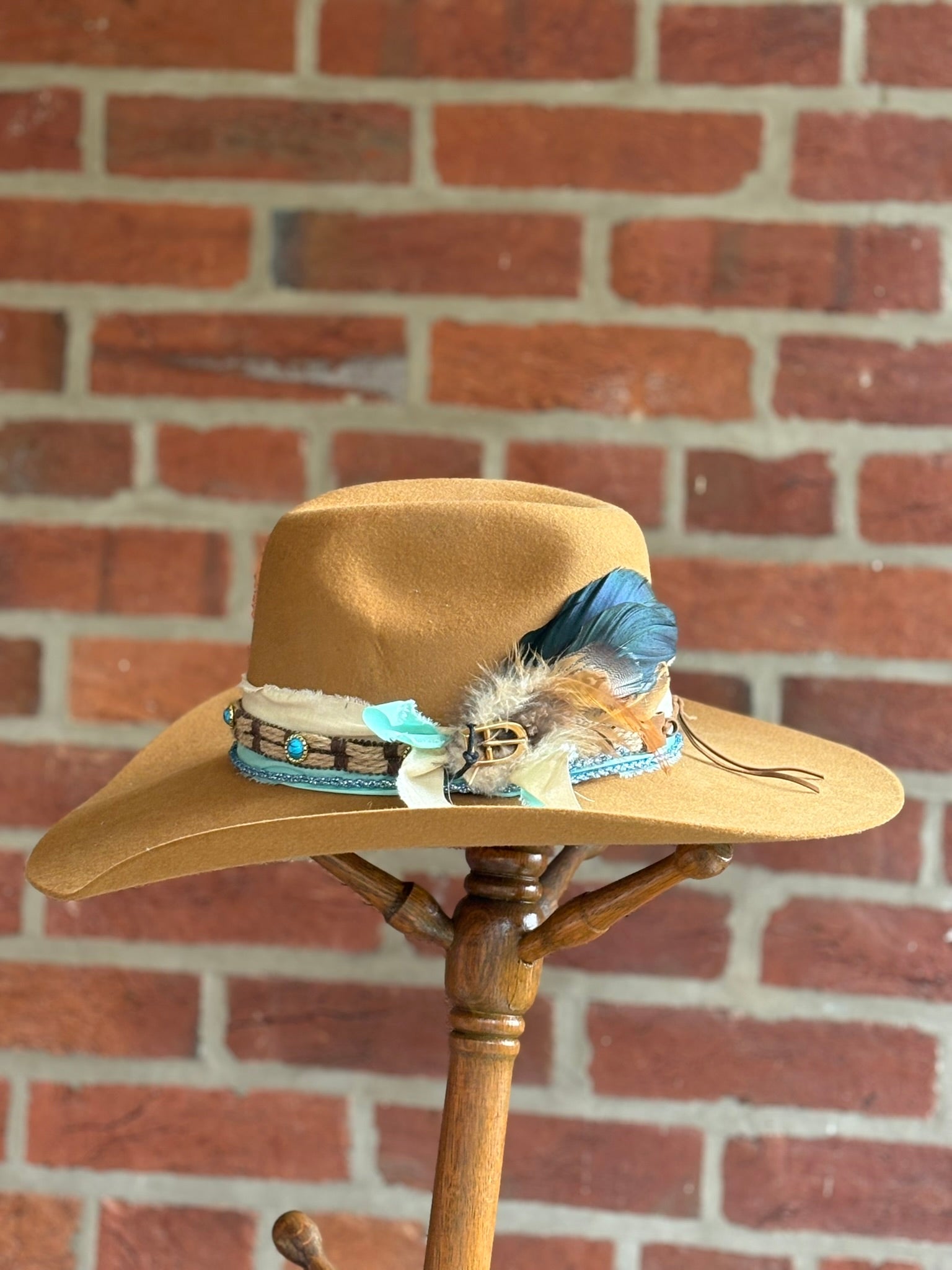 Rich color with western soul this hat has turquoise and feather fantisizer. Made of a cashmere wool blend