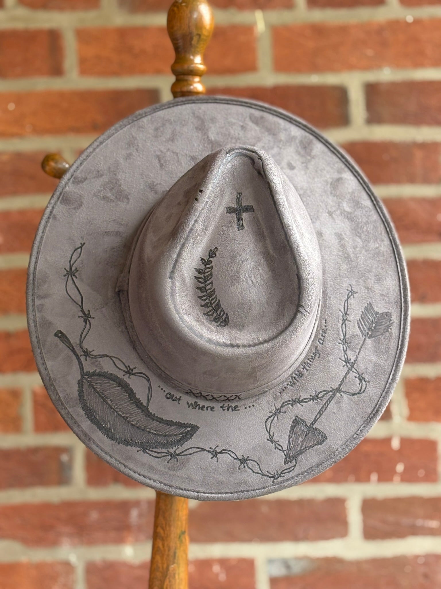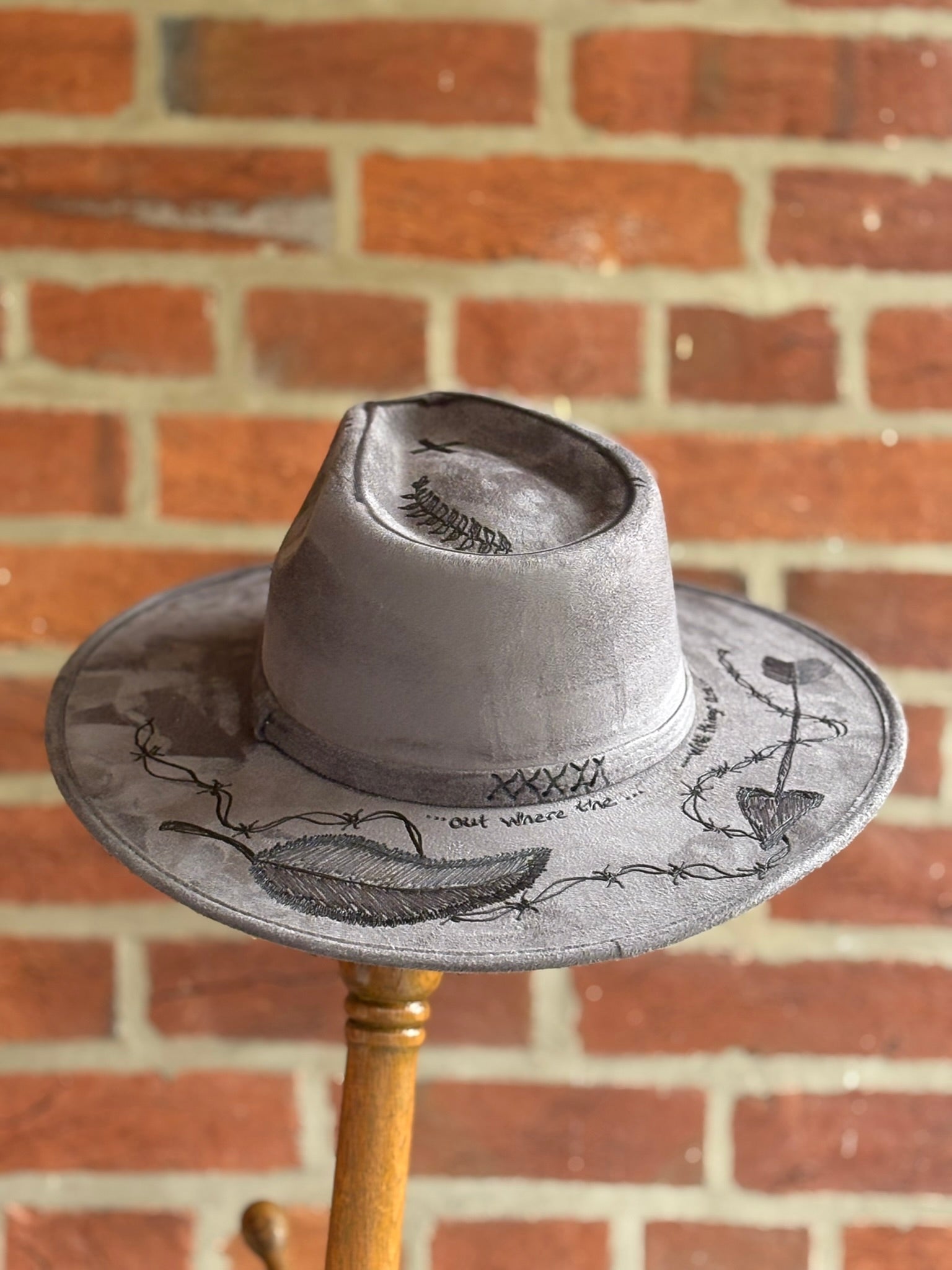 The gray rancher features barb wire, feather and arrows stating out where the wild things are.