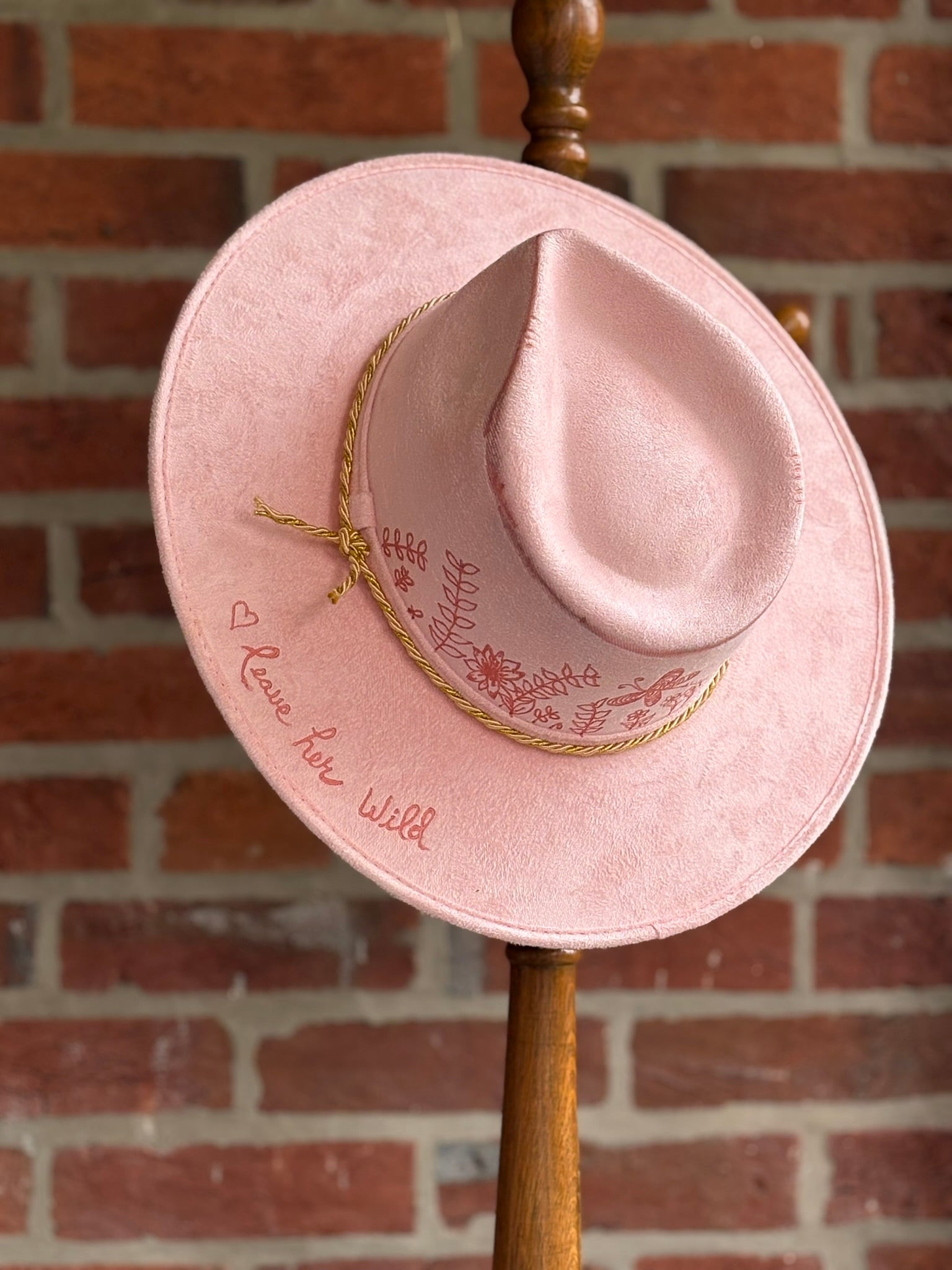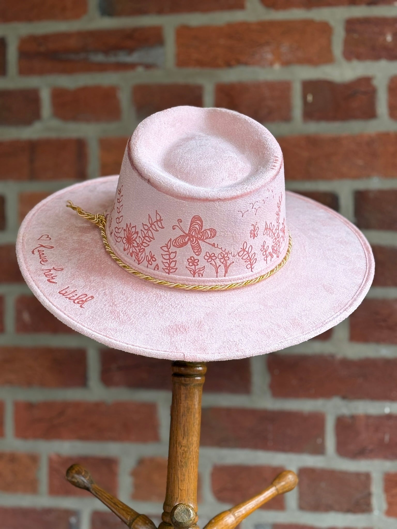 The soft pink Leave her wild with the wildflowers is a elegant and sweet hat to be worn most anywhere.