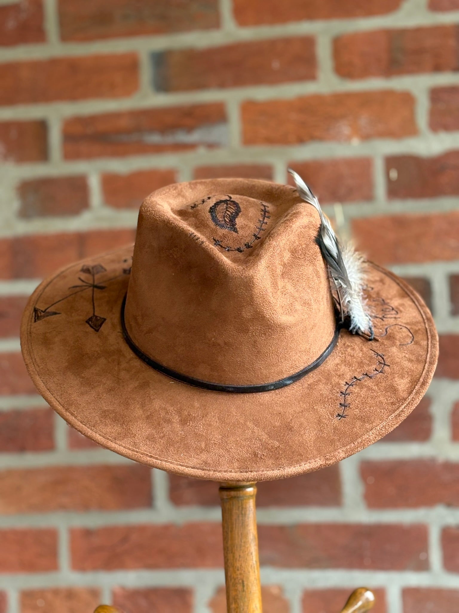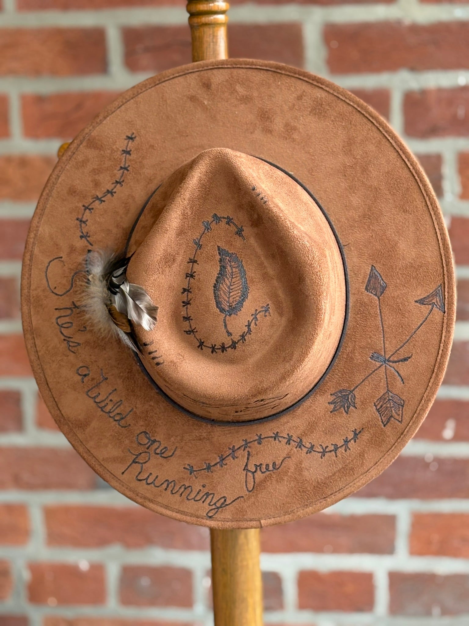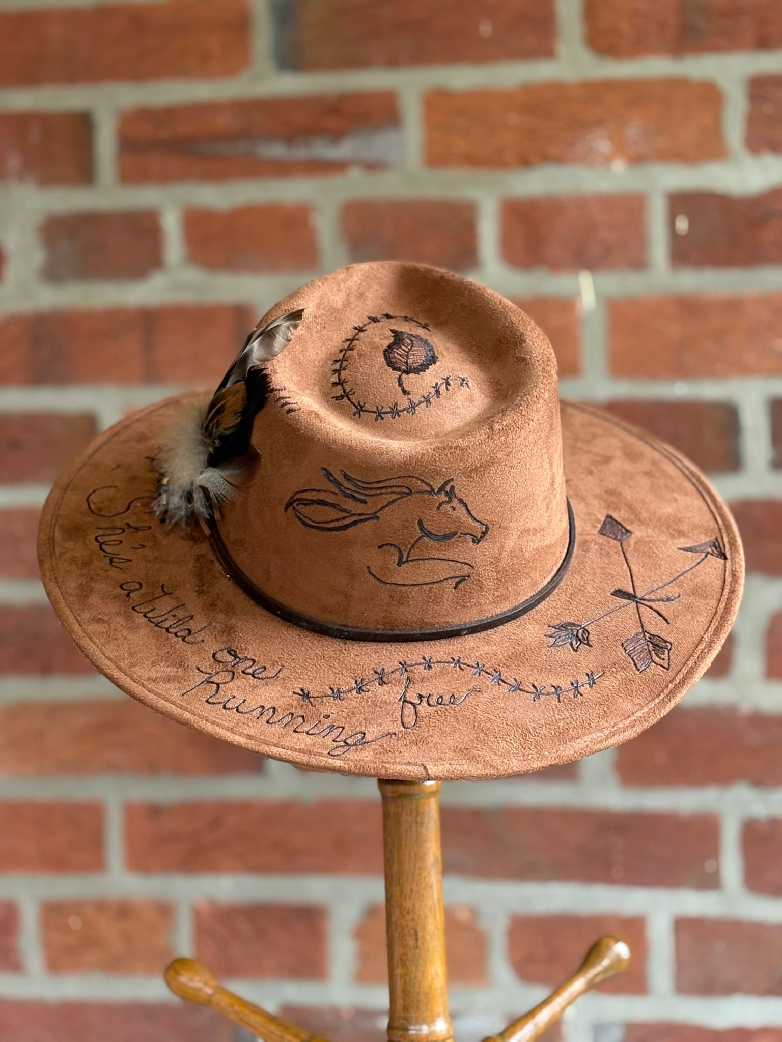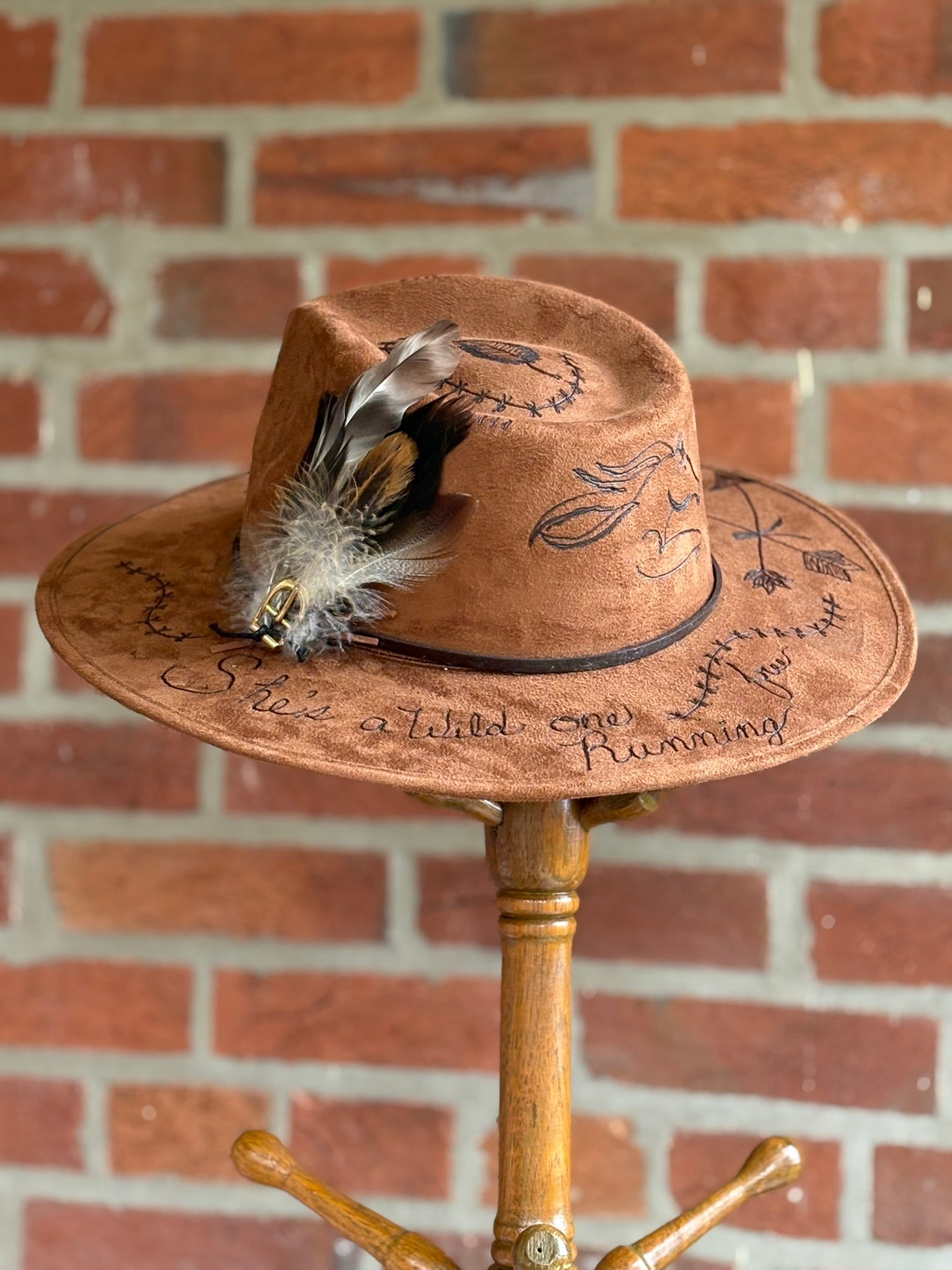 The brown flat brim "She's a Wild one Running Free" is western all over and accented with a feather accessorizer