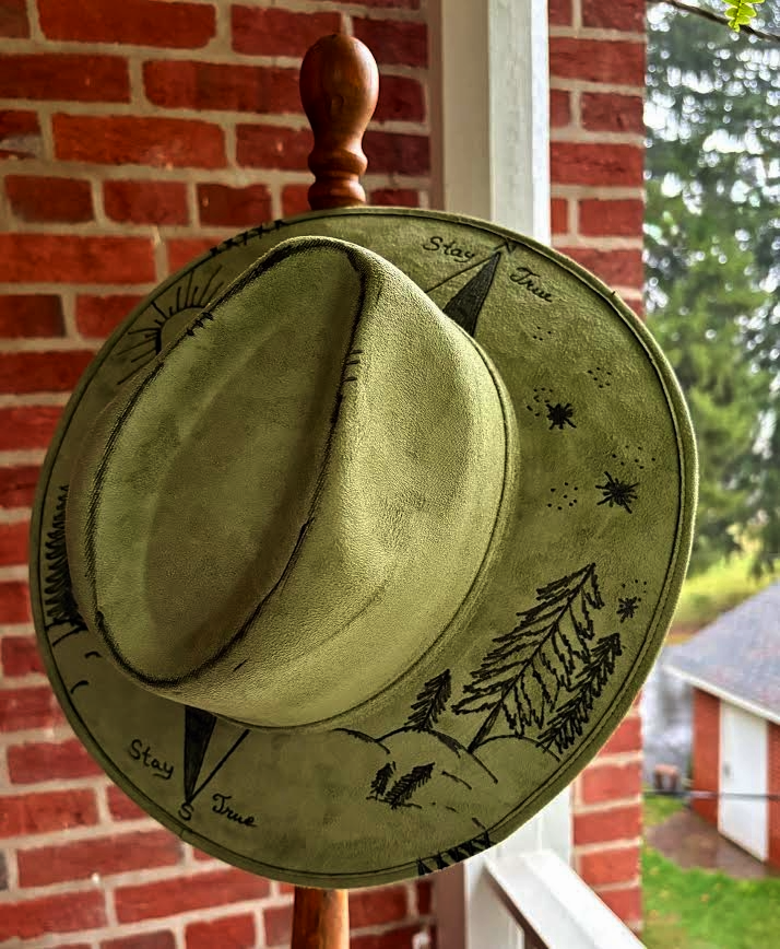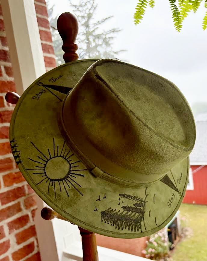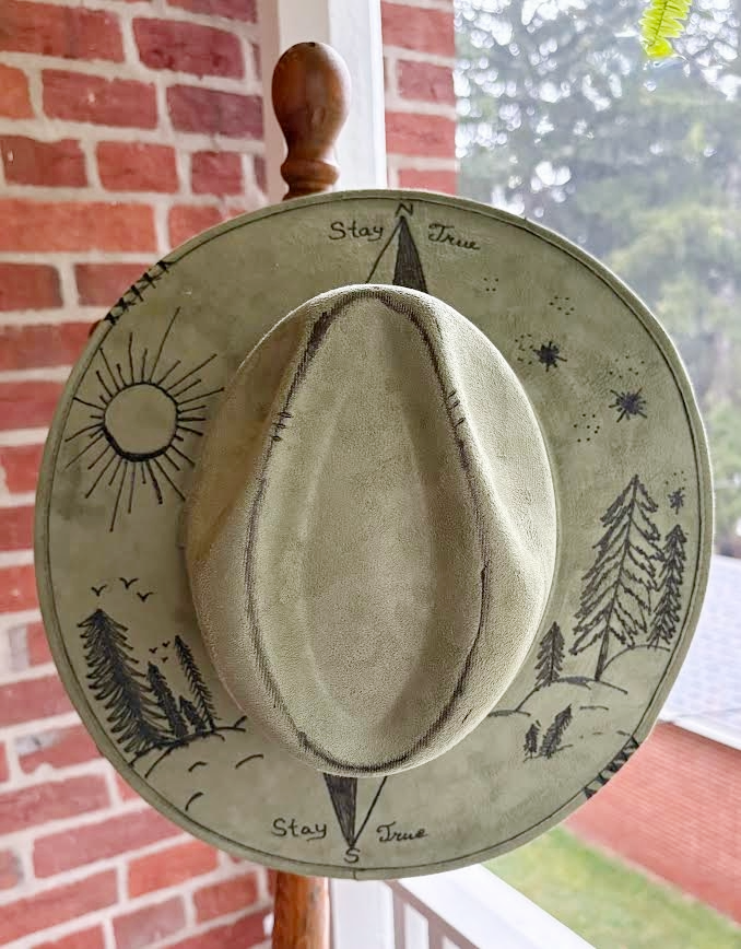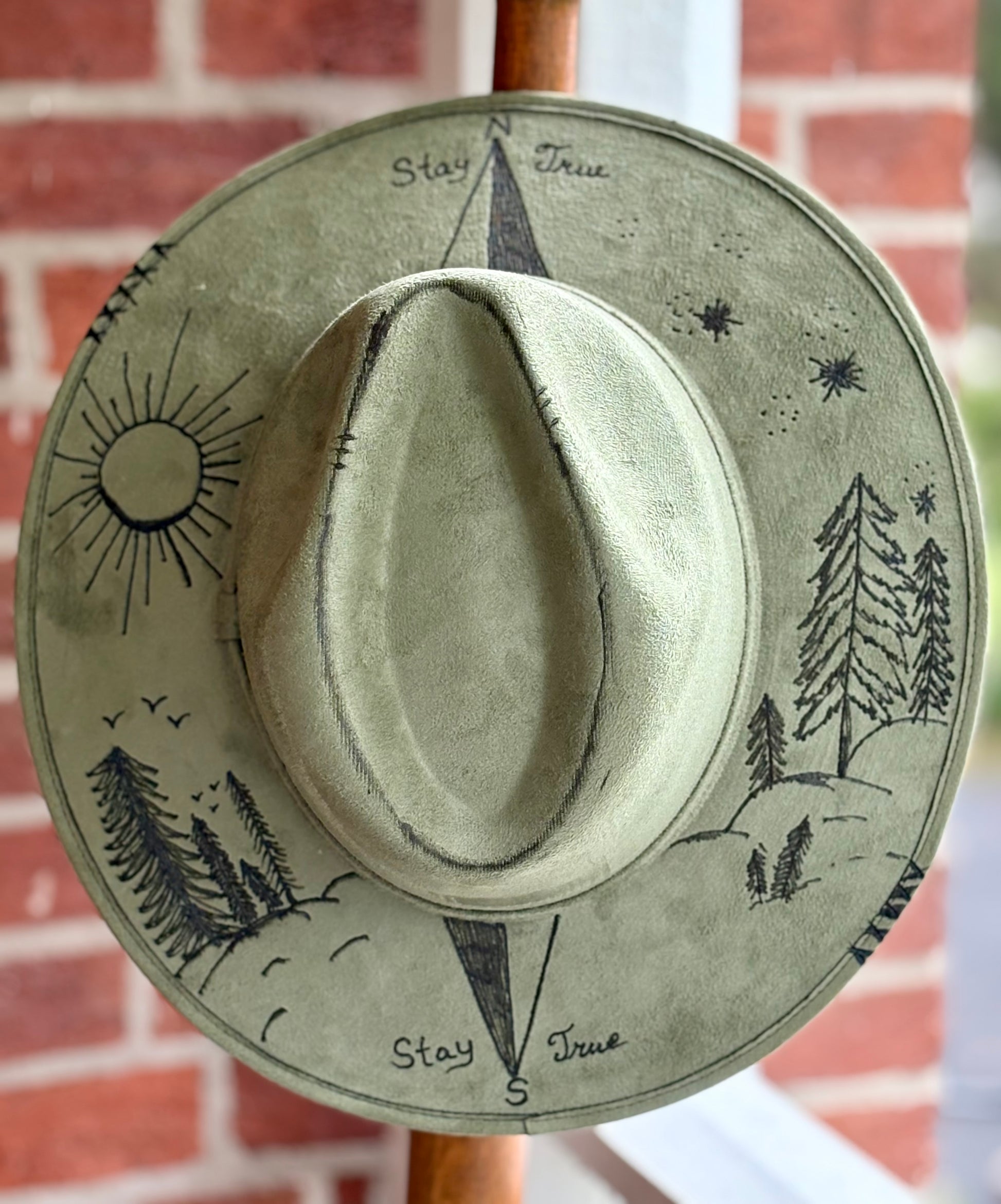 Crafted from fine suede leather, this fedora is a classic, vintage-inspired piece with a soft wide brim that exudes elegance and timeless charm. It features a beautifully detailed compass and the sun of the day with the stars of the night, symbolizing direction, light, and adventure.